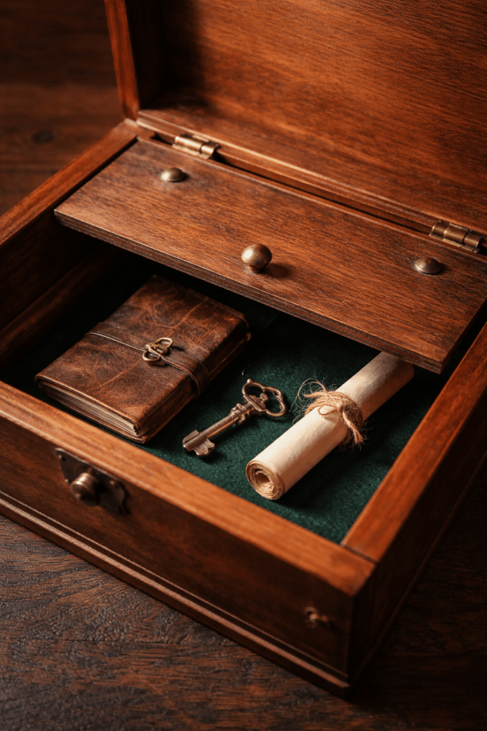 are concealed spaces built into furniture or props to store clues or small items. They are not immediately visible and are typically discovered through careful observation, touch, or logical reasoning.