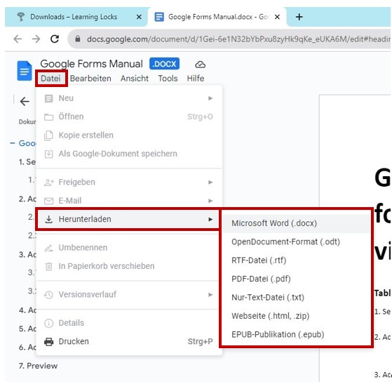 A Google document will open in a new window. In this document, go to File (Datei) > Download (Herunterladen) and click on the file type you want to save the document as.