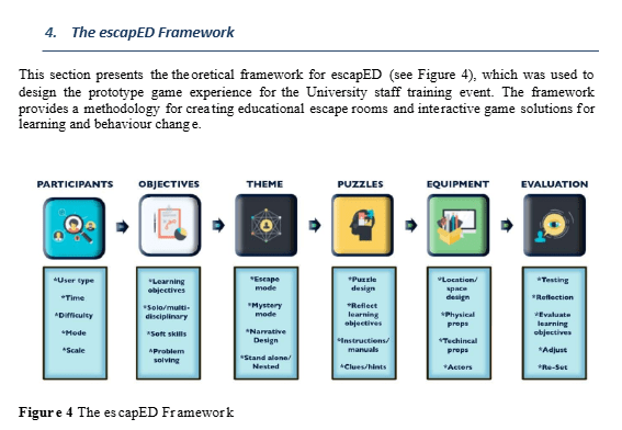 The EscapED framework is a structured design model for developing educational escape rooms and interactive game-based learning experiences tailored to higher and further education, guiding educators in creating non-digital, human-centred activities that align engaging gameplay with explicit learning objectives and promote skills such as collaboration and problem solving.