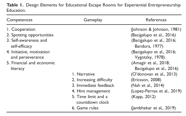 This study examines how educational escape rooms (EERs) can be designed to support experiential entrepreneurship education by identifying and empirically evaluating a set of core design elements—drawn from social cognitive theory, entrepreneurship competences, and gamification literature—and testing an escape room prototype with university students to determine which elements effectively foster entrepreneurial skills and which require refinement.