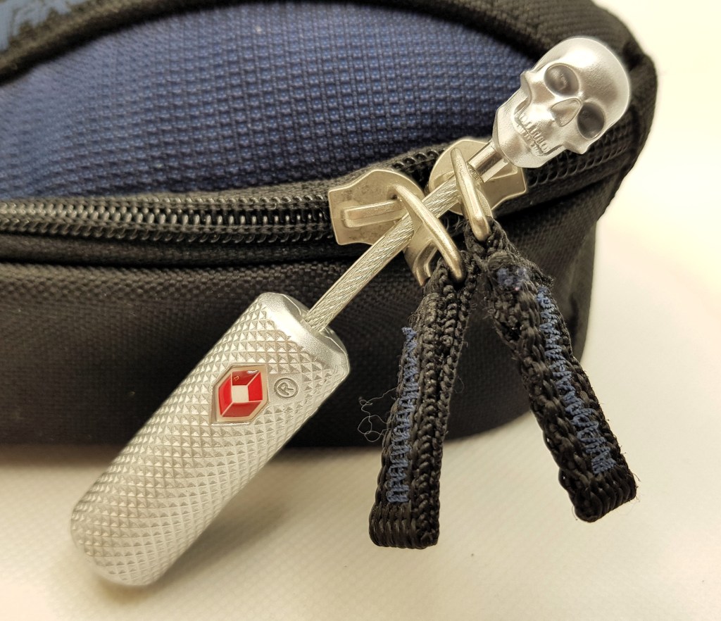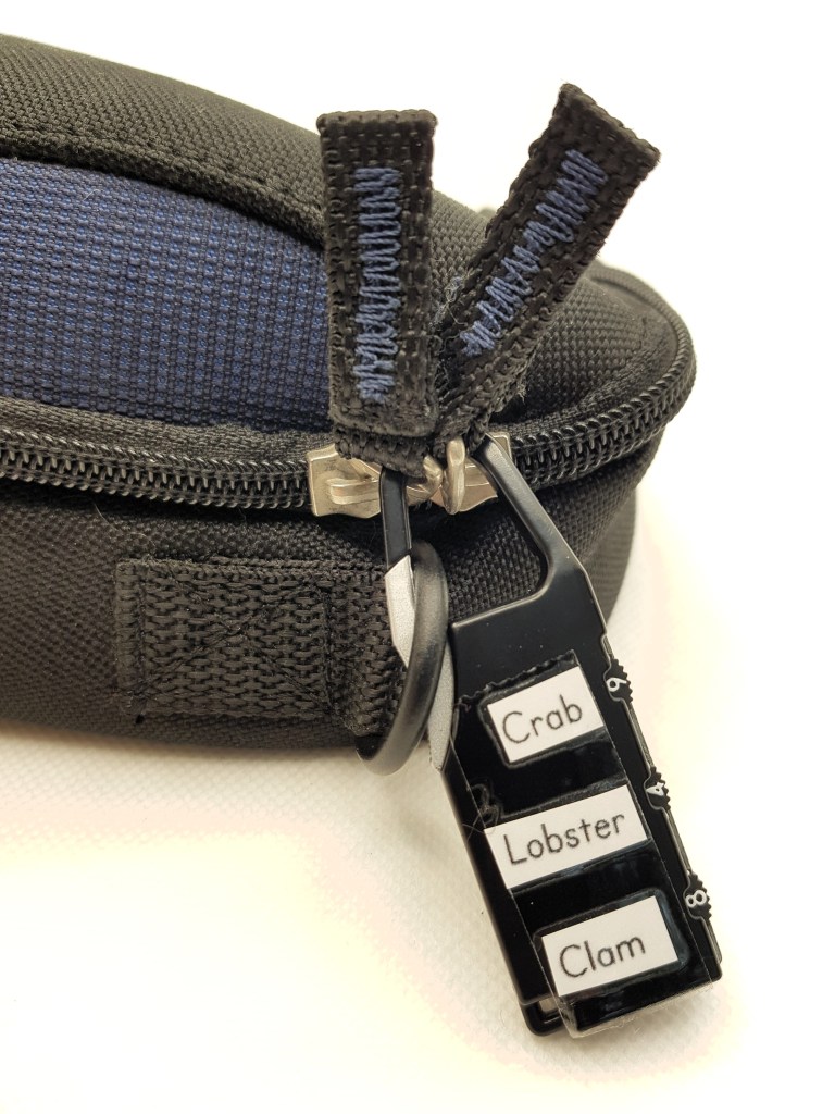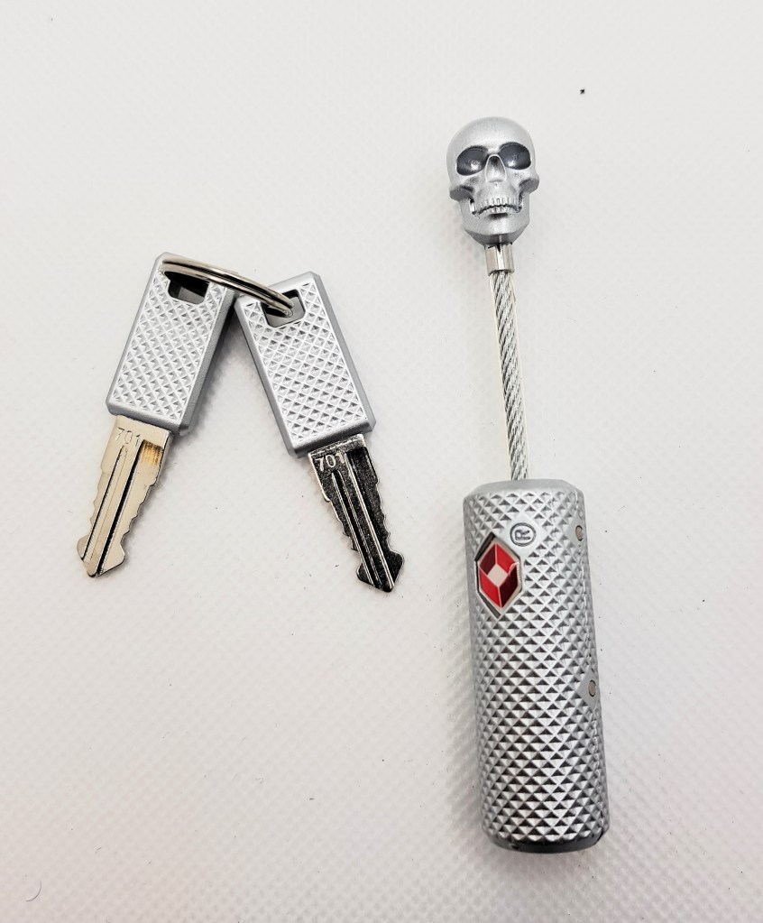 With this lock, you can make a lockable container out of any bag that has two zippers: just insert the cable pin through the zippers and into the lock. The bag can now only be opened with a key. These locks can surprise and intrigue players because they don’t immediately appear as locks.