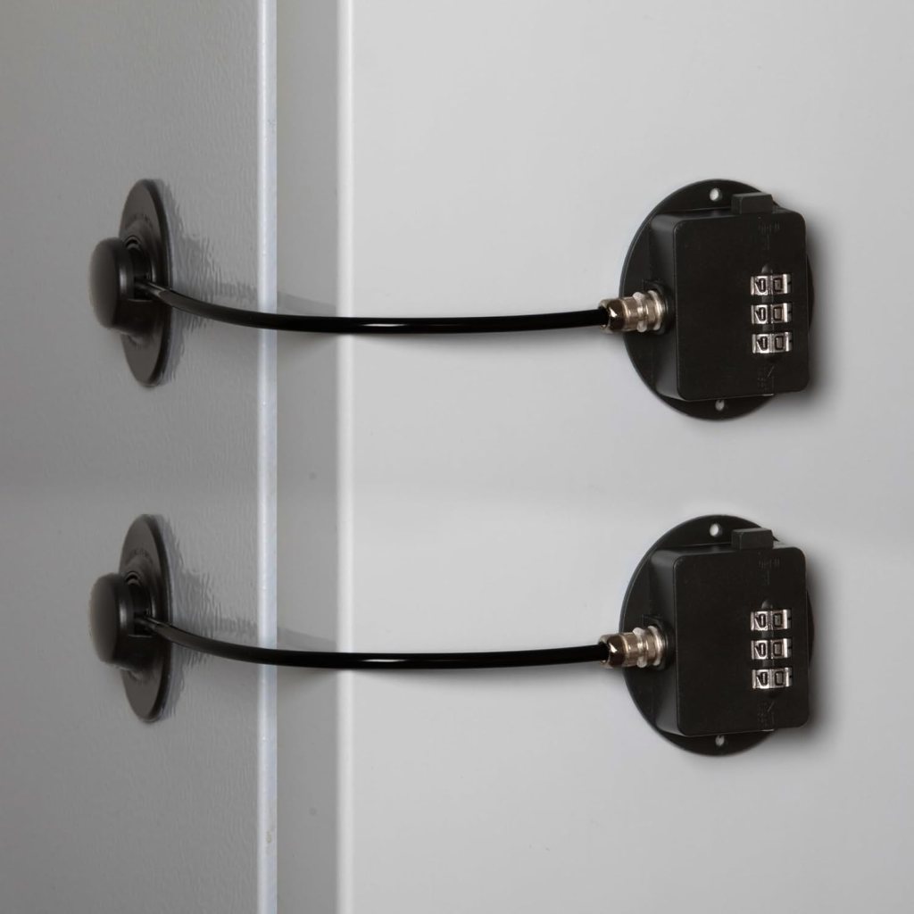 This padlock comes with an elastic cable that is quite long, despite its small size. This allows you to connect large or multiple items, for examples two door handles of a cabinet.