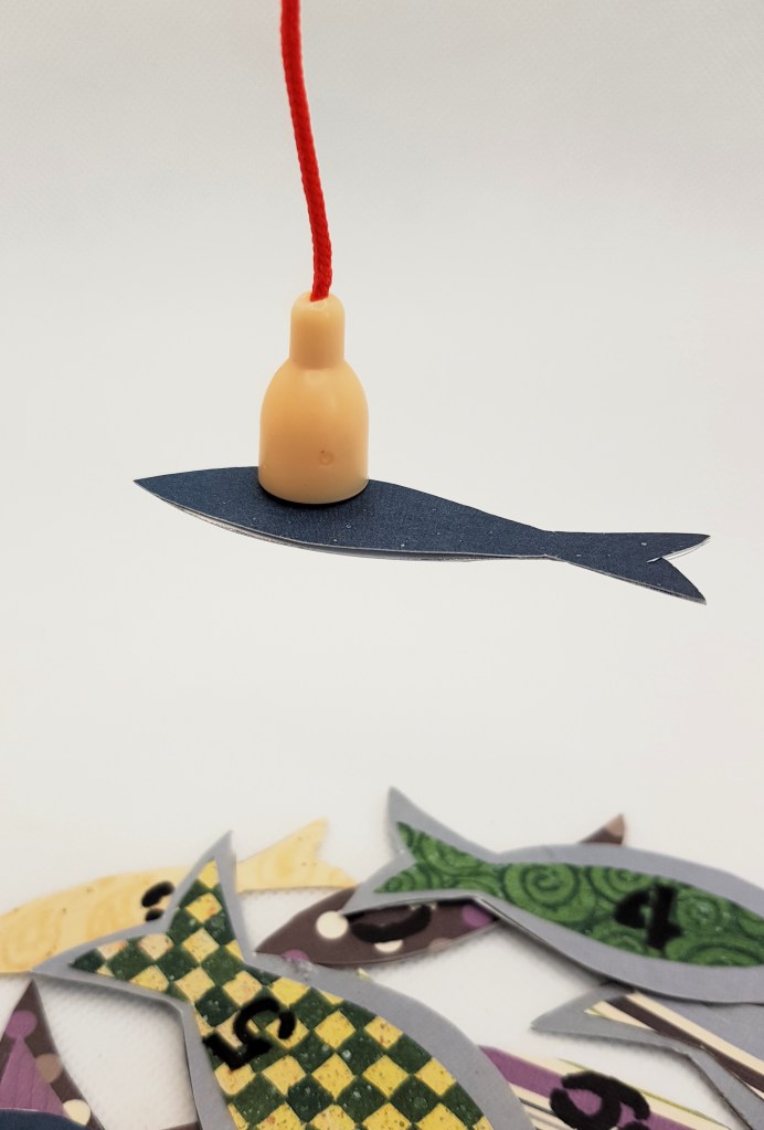 Paper fish filled with metallic paper clips must be caught with a magnetic rod. The numbers, symbols or letters on the fish provide a code.