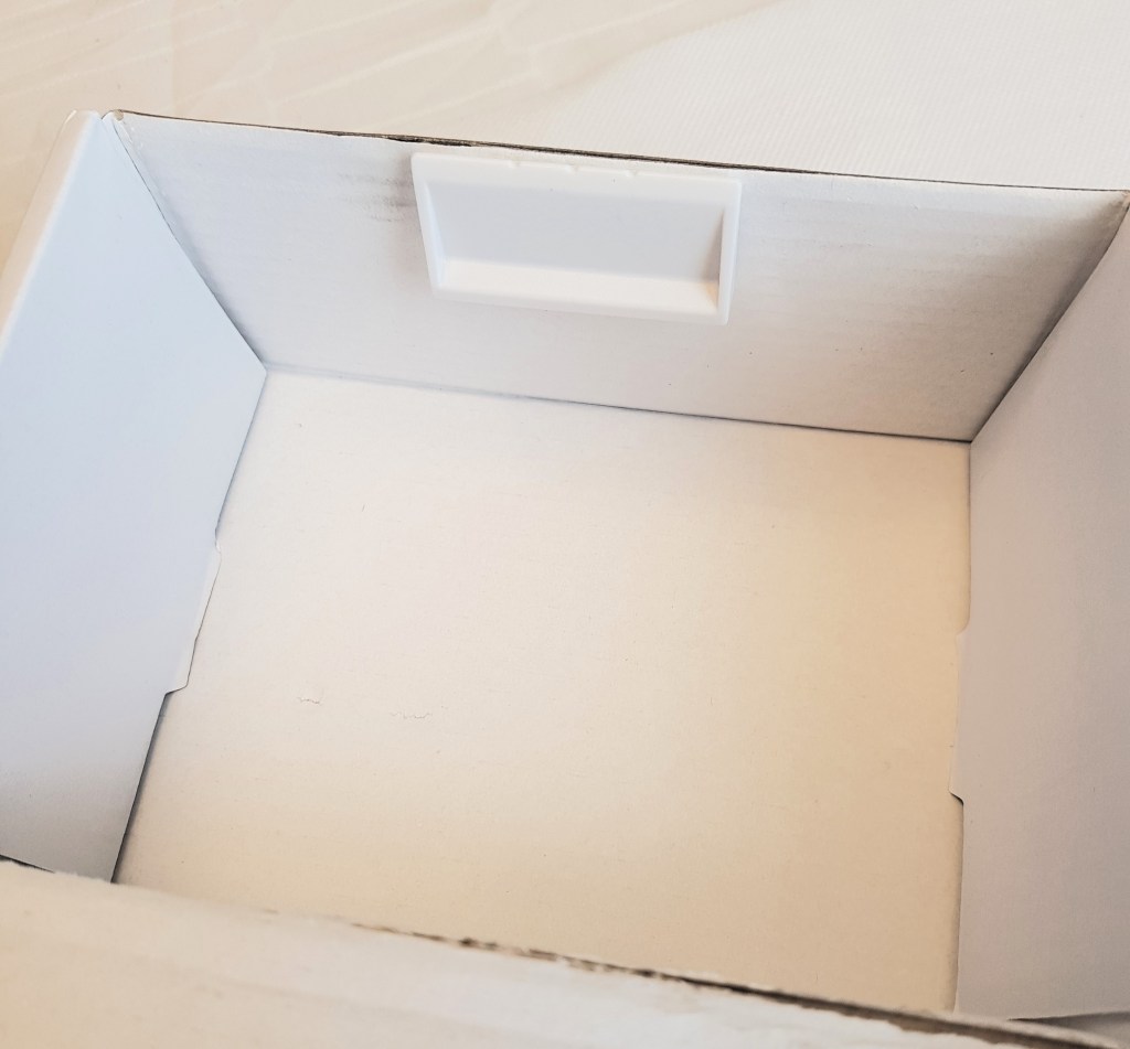 After removing the adhesive tape, glue the catcher to the upper end of the front side of the box.