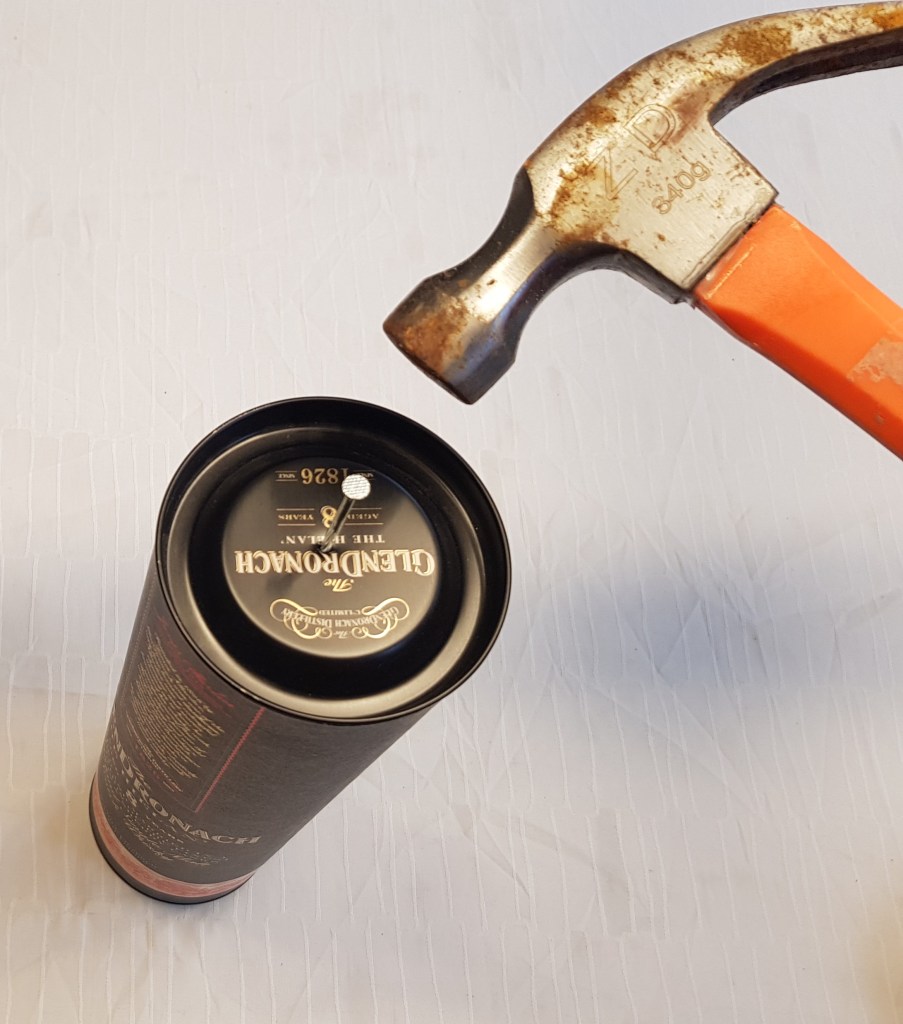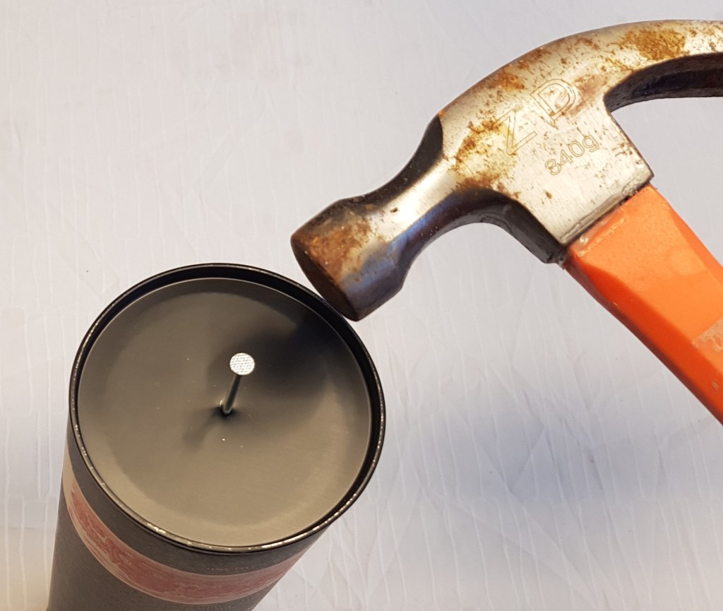 Use the hammer and the nail to punch a hole through the bottom of the container.