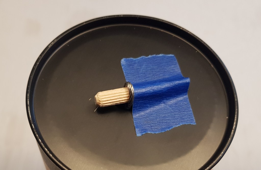 Stick the dowel through the loop in order to prevent the wire from sliding through the hole.