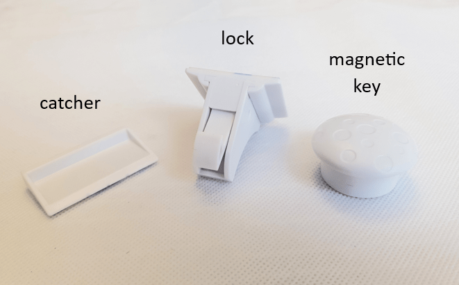 They consist of a catcher, a lock and a magnetic key and usually come with a mounting mechanism to make sure that the catcher and the lock are aligned during installation.
