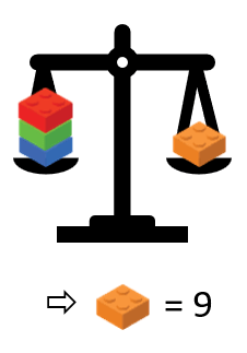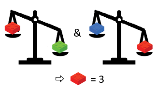 Now it gets a little more tricky, because red is not a combination of any of the known numbers. However, by comparing red, green and blue, players can find out that red is heavier than green and blue is heavier than red, making red equal to 3.
