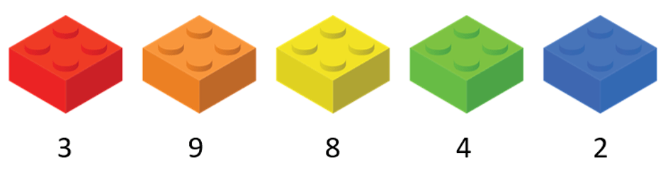The weight of each color, however, is different. In this example, red weighs 3, orange weighs 9, yellow weighs 8, green weighs 4 and blue weighs two.