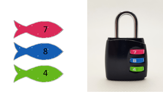 - If you are not using any color code on you lock, players need a clue in order to figure out in which order the numbers are entered into the lock (e.g. largest fish corresponds to the number on the top, smallest fish corresponds to the number on the bottom), for example in the form of a prop (like a note).